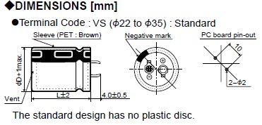 Specifications: (1)Category Temperature Range: -40 to +105℃(35&50Vdc), -25 to +105℃ (160 to 450Vdc); (2)Rated Voltage Range: 35&50Vdc, 160 to 450Vdc; (3)Capacitance Tolerance: ±20% (M); (4)Leakage Current: I≤3 √CV Where, I : Max. leakage current (uA), C : Nominal capacitance (uF), V : Rated voltage (V); (5)Endurance: Capacitance change: ≤±20% of the initial value; D.F. (tanσ)≤200% of the initial specified value; (6)Leakage current: ≤The initial specified value; (7)Shelf Life: Capacitance change: ≤±15% of the initial value; D.F. (tanσ)≤150% of the initial specified value; (8)Leakage current: ≤The initial specified value.